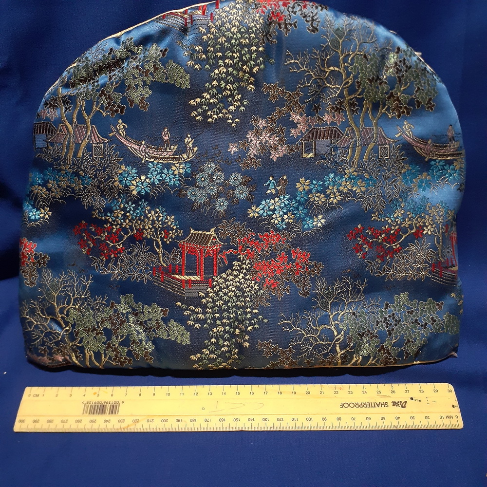 Oriental design on satin material.  This padded tea cosy is in very nice unused vintage condition.   No stains.   Piped. 32 x 26 cms