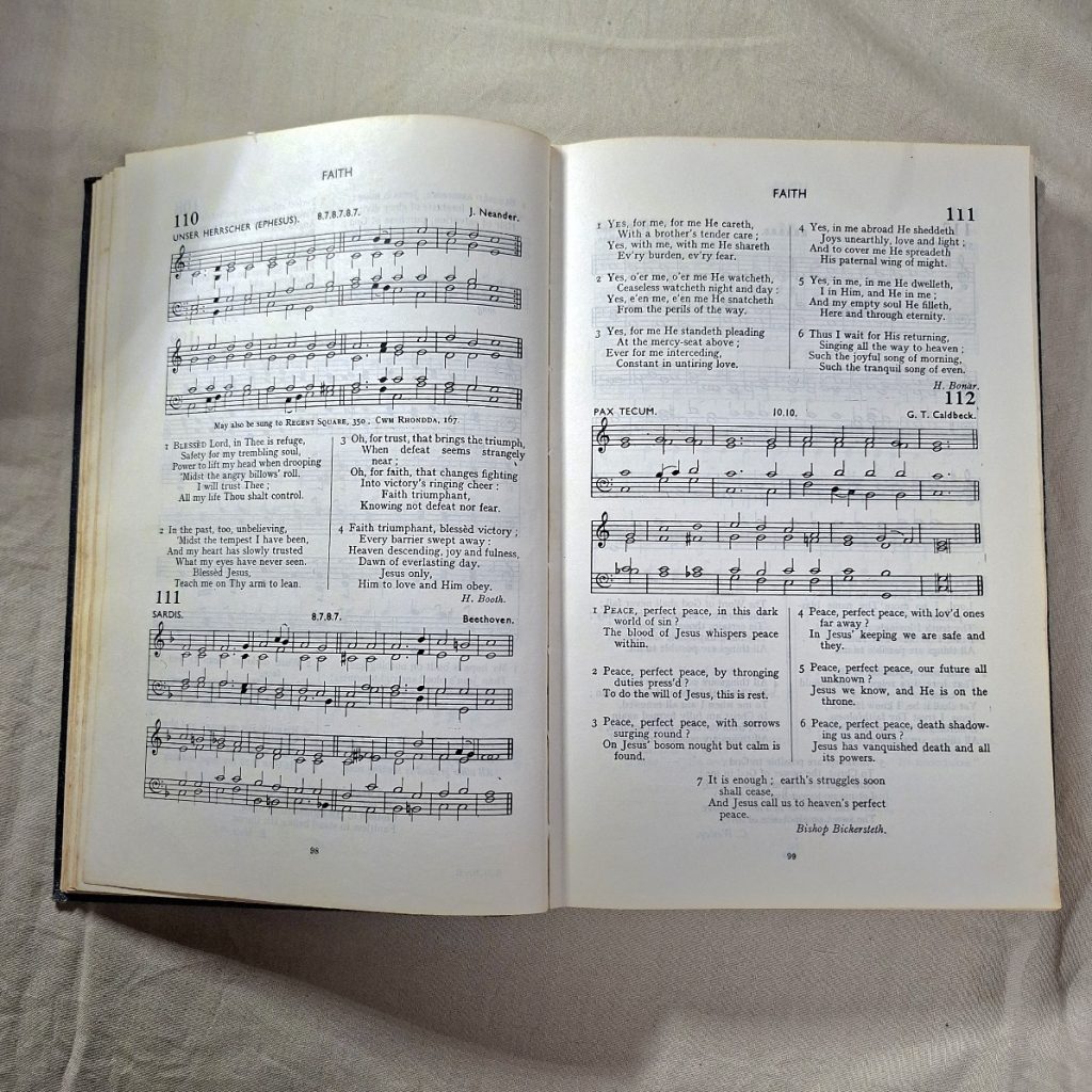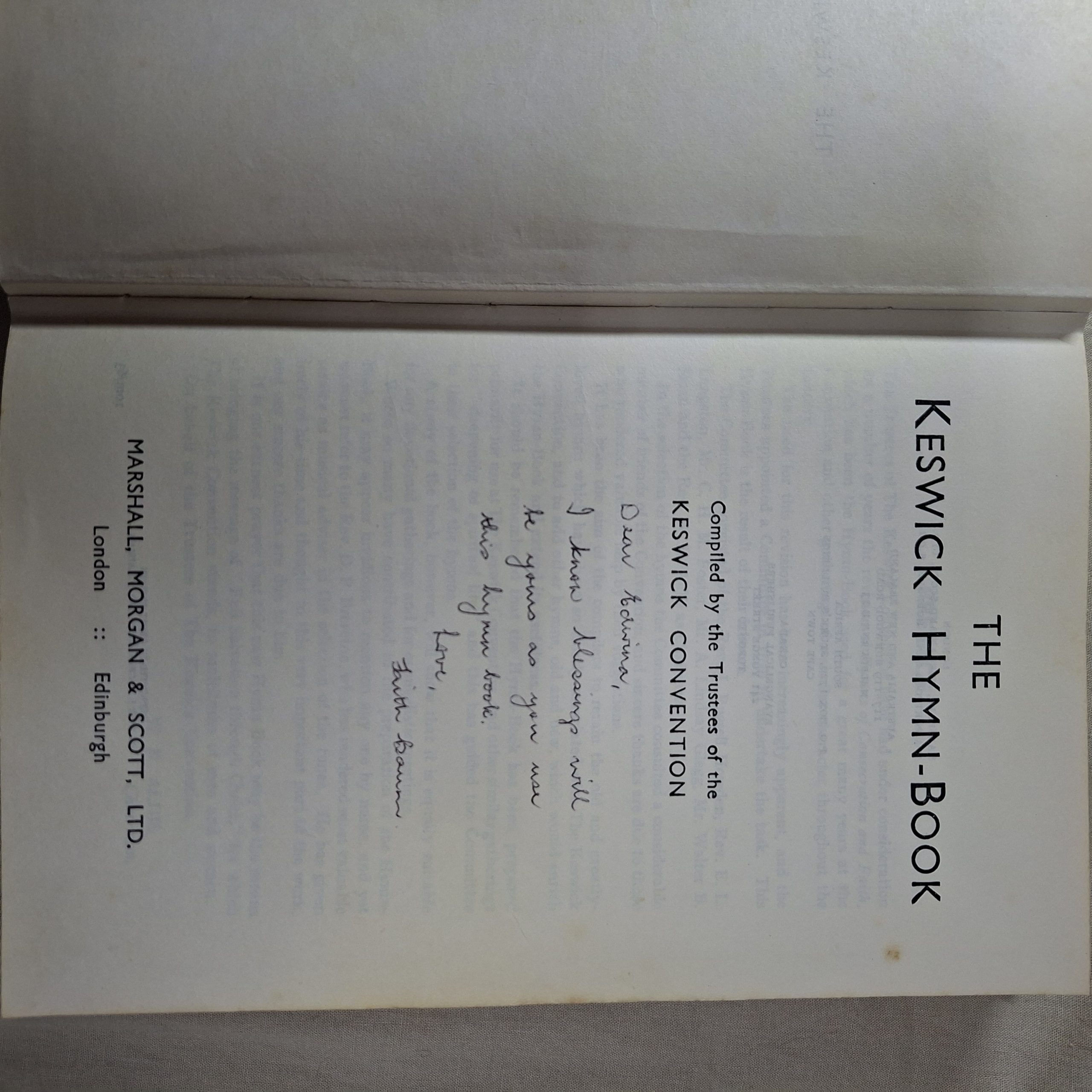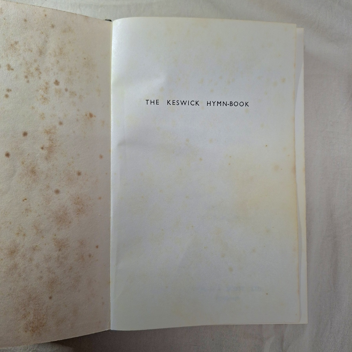 The Keswick Hymn Book – words and music.   No dust cover.  Yellowed inside front and back pages with tape marks.   Previous owners inscription in front. Content clean and the book tight.  Outside cover a litttle bumped from use.