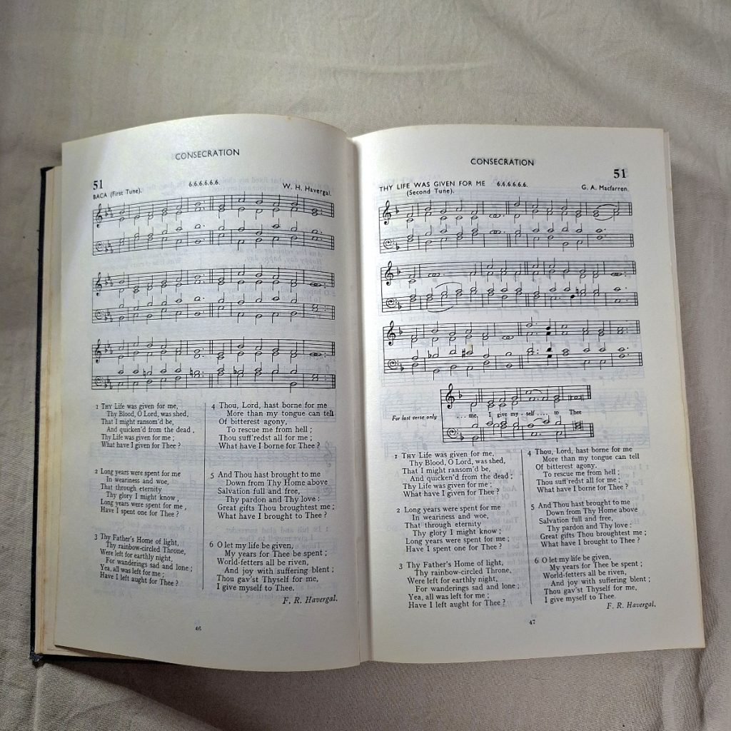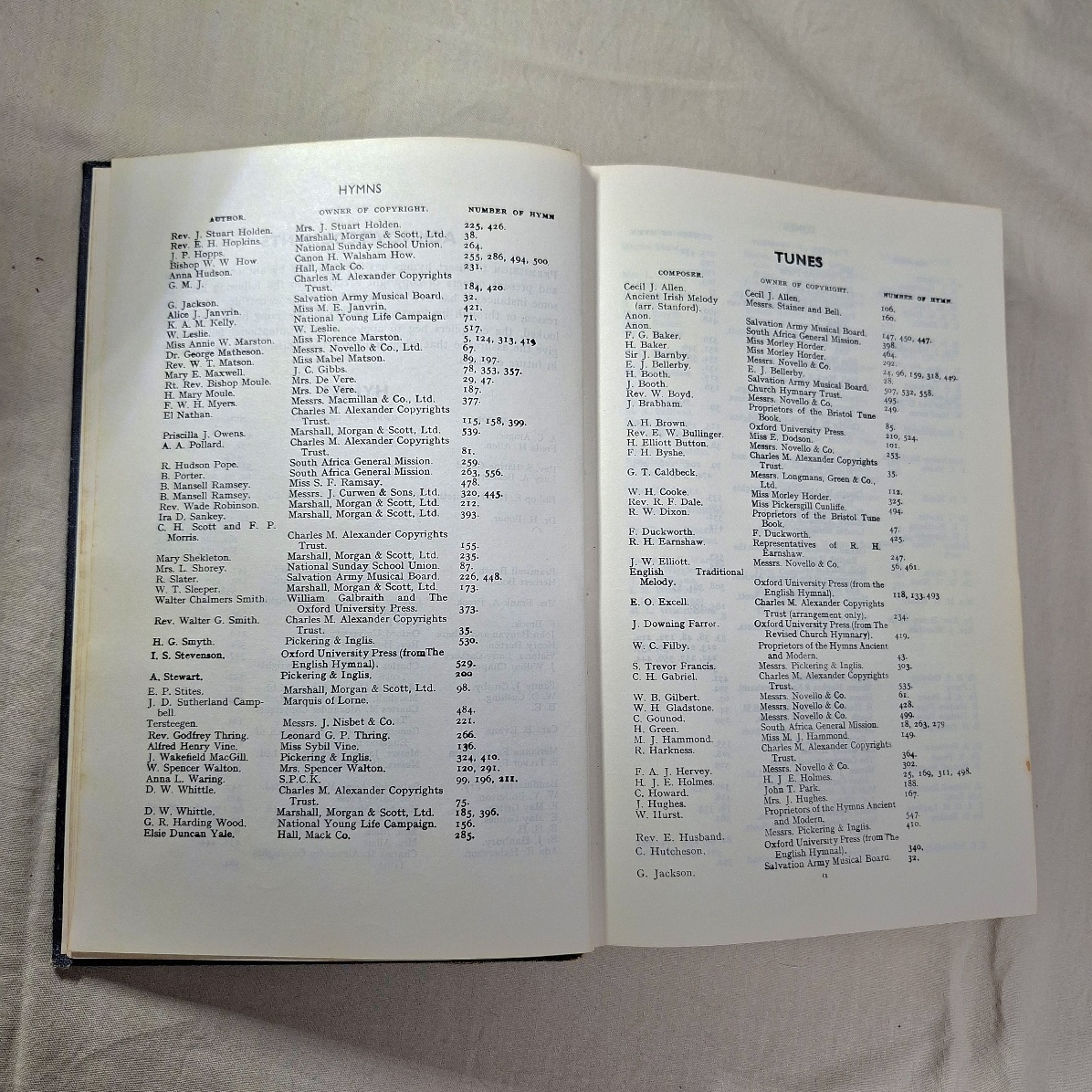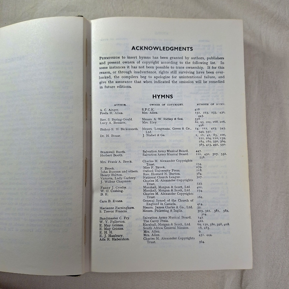 The Keswick Hymn Book – words and music.   No dust cover.  Yellowed inside front and back pages with tape marks.   Previous owners inscription in front. Content clean and the book tight.  Outside cover a litttle bumped from use.