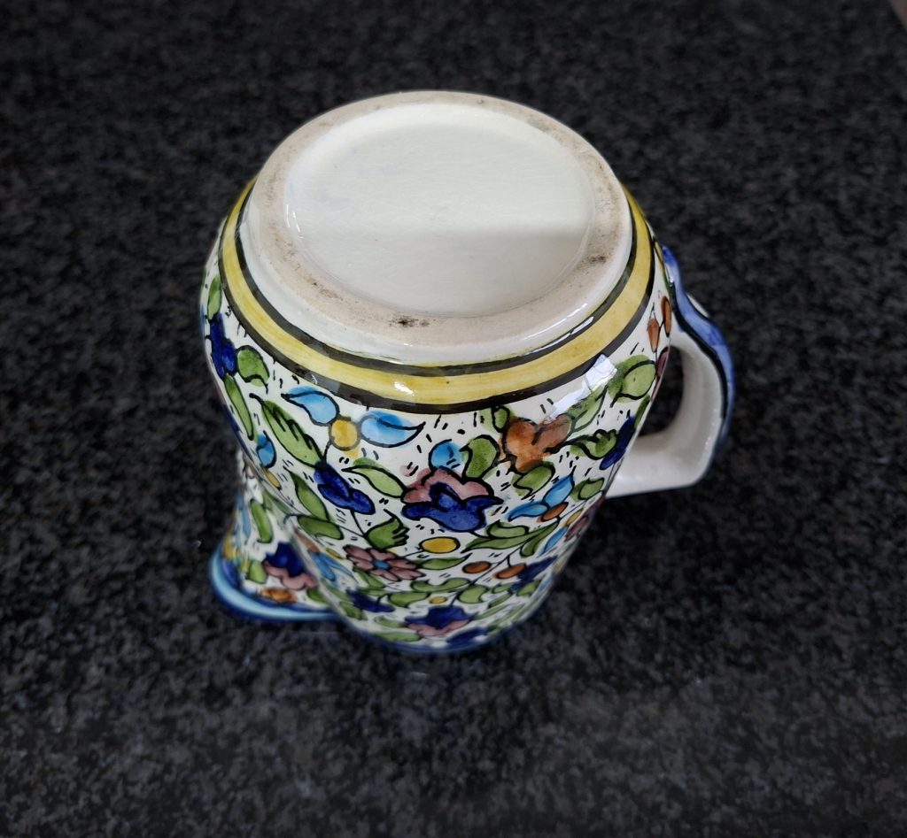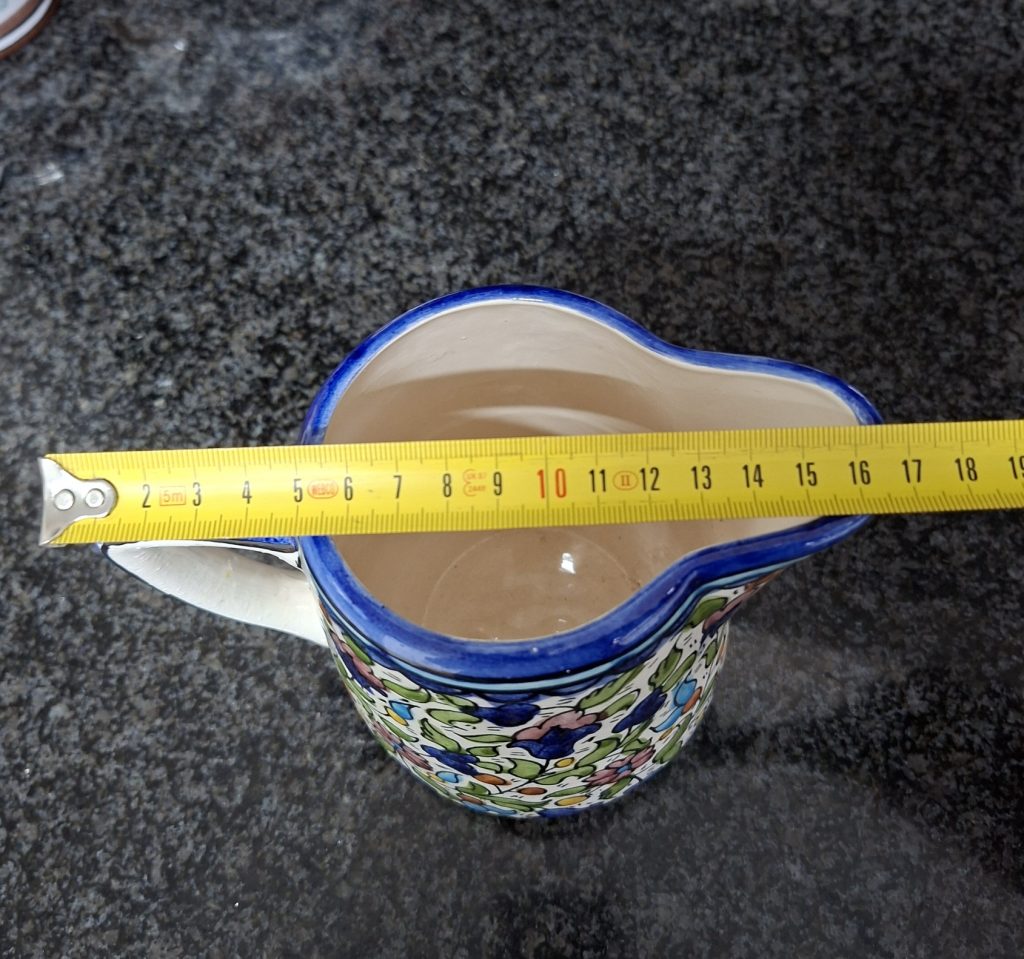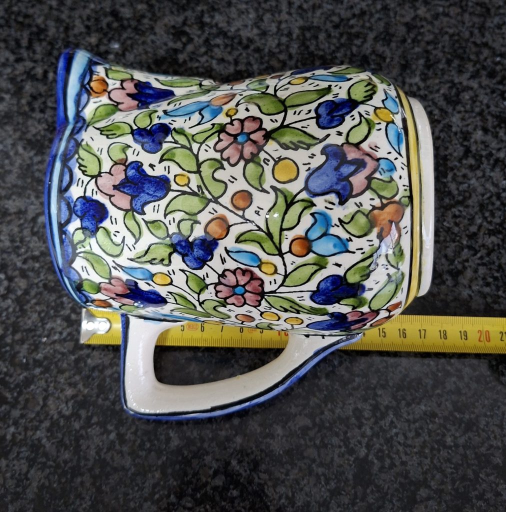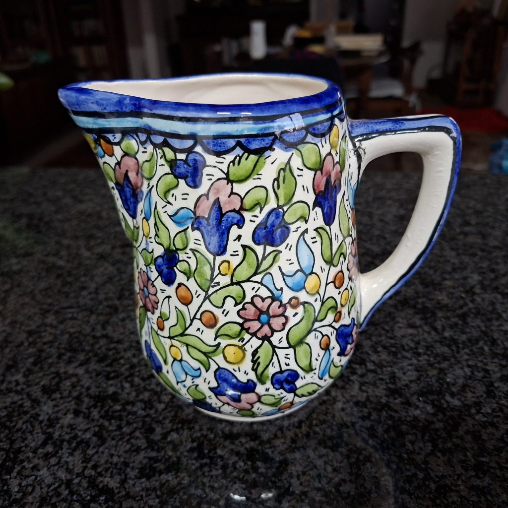 Pretty blue and white with floral motifs. Hand painted jug. Vintage Jerusalem pottery. In used vintage condition. No cracks or chips. Dont hesitate to ask any questions.