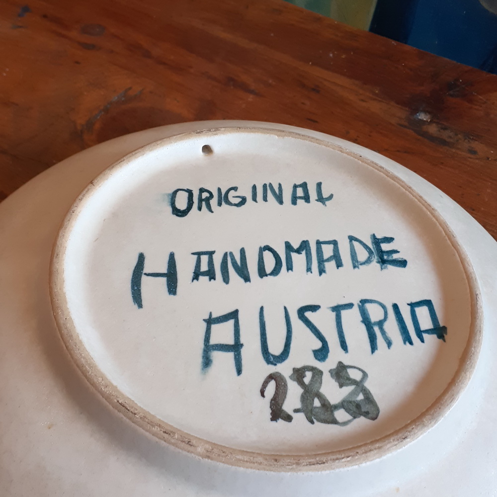 Lovely one of a kind hand painted Austrian Pottery wall plate. Has a hole in the back to attach a hanger. No chips or cracks. In used vintage condition.